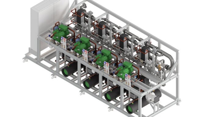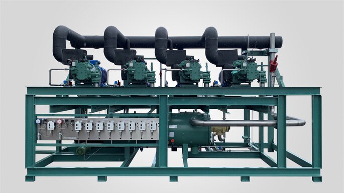 Mehrverdichtersystem mit R744 für NK/TK/Prozesskälte; modular skalierbar.