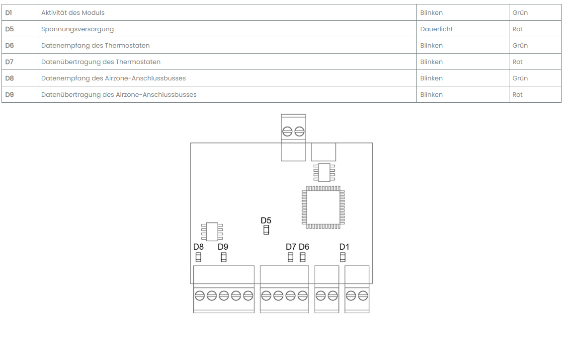 Lokales Steuermodul zur Steuerung des Öffnens und Schließens der Klappen. Kommunikation mit dem Zonenthermostat über Kabel. Stromversorgung über den Airzone-Anschlussbus des Systems.