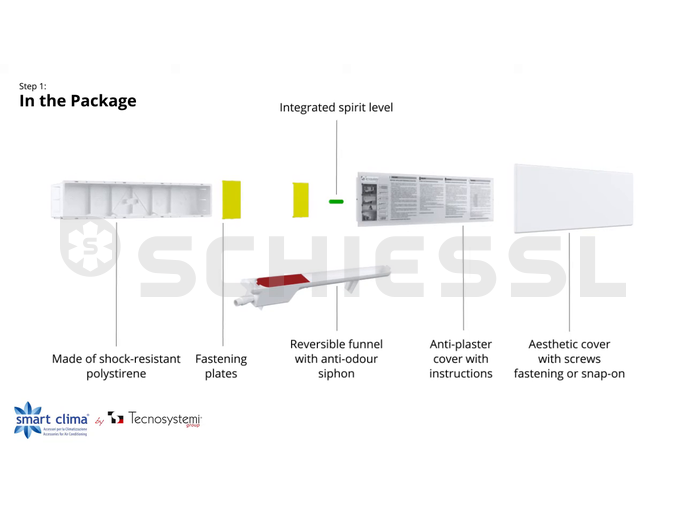 Der Trichter im unteren Bereich der Installationsbox ist drehbar und garantiert einen freien Kondensatwasserablauf. Dies wiederum verhindert schlechte Gerüche. Um den Innenraum während der Installation vor Schmutz (Putz, Farbe, etc.) zu schützen, kann ein einfacher Kartonschutz an der Vorderseite angebracht werden.