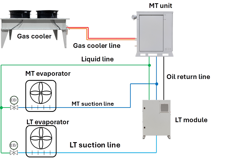 At the heart of the condensing unit is a transcritical CO₂ compressor equipped with innovative dynamic vapour injection (DVI technology). DVI enables the direct injection of flash gas into the compressor, resulting in efficient and smooth operation regardless of outside temperatures. This prevents the system from shutting down in summer. An intelligent control concept manages all system components and ensures efficient and reliable operation whilst maintaining consistently high food quality.