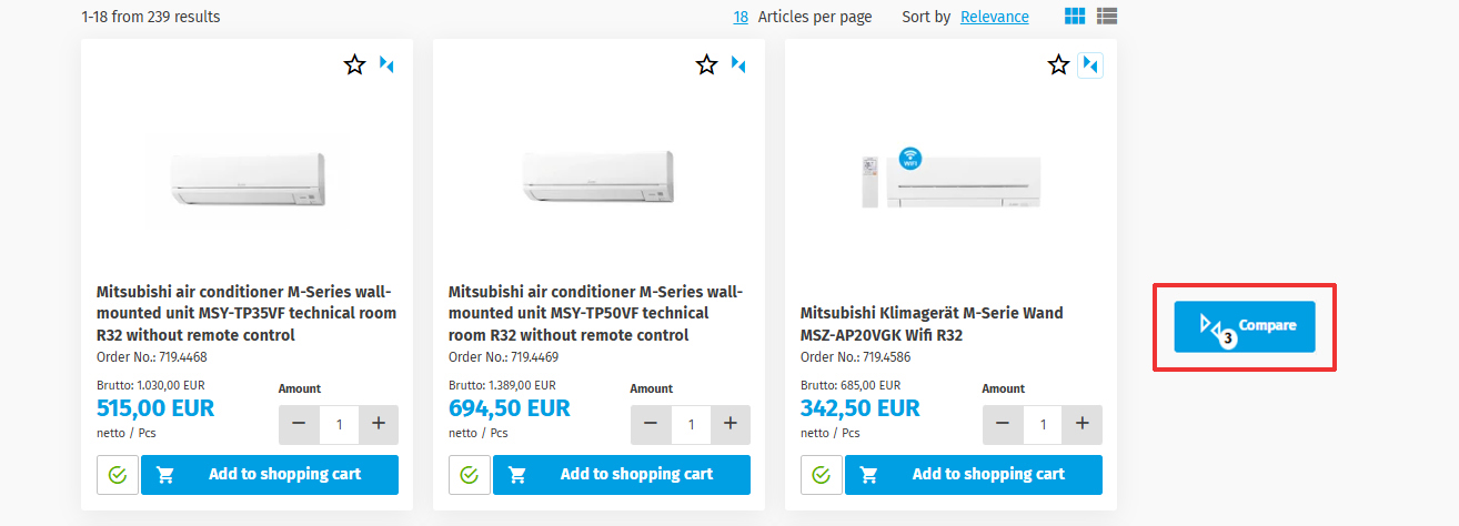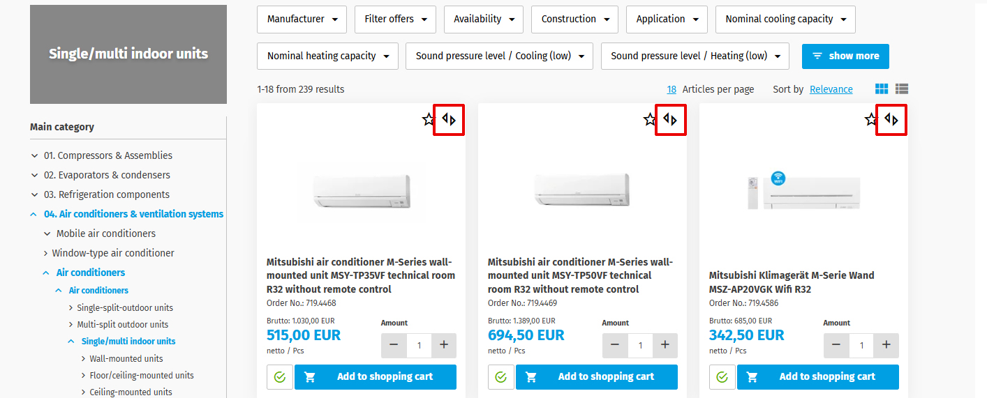 Step 1: First select your desired product category. In the product overview, you will see the comparison symbol at the top right of each item. Click on this symbol to add the item to the comparison list. You can compare up to three products with each other.