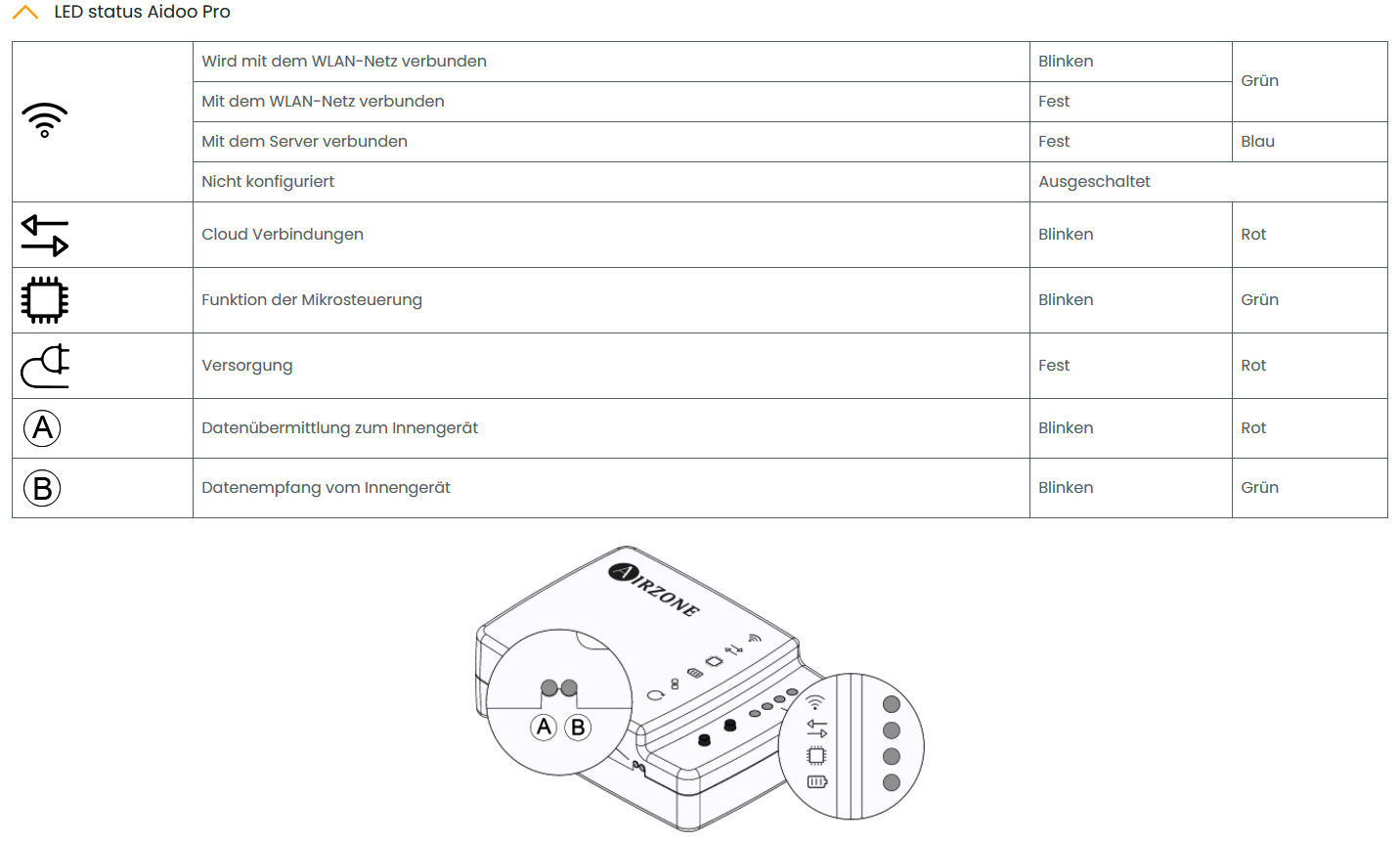 Gerät zur Fernverwaltung und Integration von Geräten über Cloud-Dienste. Steuerung über die App „Airzone Cloud“ (verfügbar für iOS und Android). Funkverbindung mit dem Netz über WLAN (2,4/5 GHz). Eigene Spannungsversorgung über mitgeliefertes externes Netzteil.