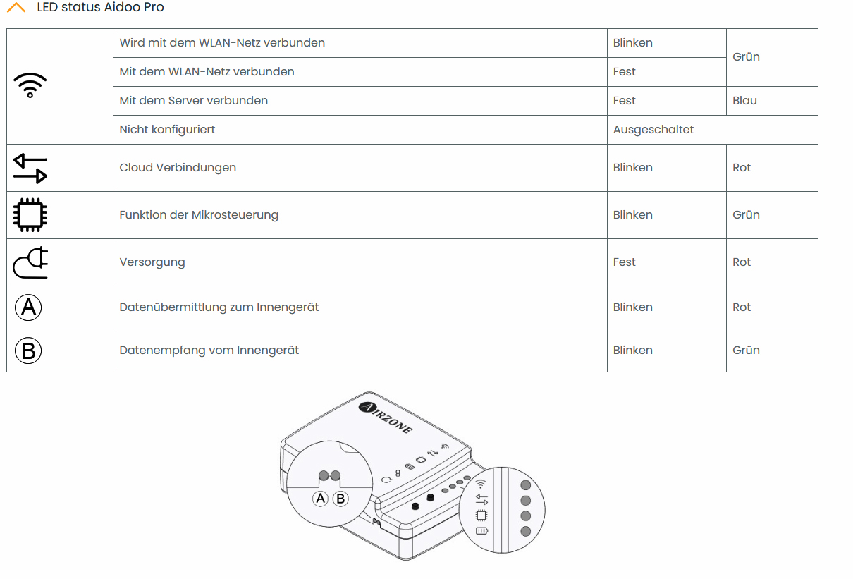 Gerät zur Fernverwaltung und Integration von Geräten über Cloud-Dienste. Steuerung über die App „Airzone Cloud“ (verfügbar für iOS und Android). Funkverbindung mit dem Netz über WLAN (2,4/5 GHz). Eigene Spannungsversorgung über mitgeliefertes externes Netzteil.