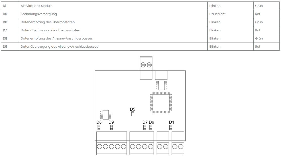 Lokales Verwaltungsmodul zur Steuerung elektrischer Strahlerelemente und Kommunikation mit dem Zonenthermostat über Kabel. Stromversorgung über Airzone Anschlussbus des Systems.